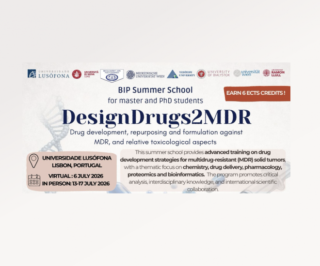 We are pleased to welcome you to the Erasmus+ Blended Intensive Programme (BIP) Summer School DesignDrugs2MDR, an international and interdisciplinary programme dedicated to addressing one of the major challenges in modern medicine: multidrug-resistant (MDR) solid tumors. This programme offers an engaging and collaborative learning experience focused on innovative drug development and therapeutic strategies.